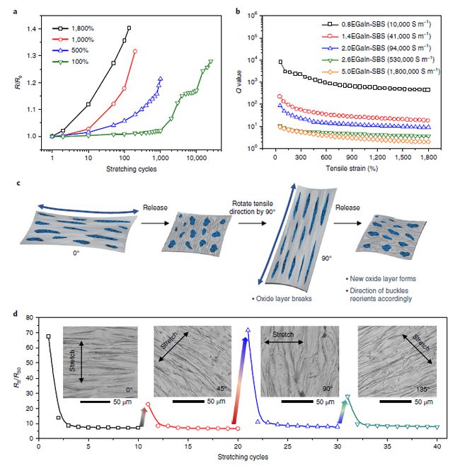 EGaIn-SBS的超高拉伸性和電穩(wěn)定性主要歸因于液態(tài)金屬,形成了橫向網狀和褶皺結構。這種結構是在預拉伸活化步驟中自形成的。在拉伸過程中,初始的EGaIn膜破裂成網狀結構,在新的表面重新形成了新的氧化層。由于氧化層比液態(tài)金屬要硬得多,因此當襯底緩慢恢復到0%應變時,較硬的上層氧化物層和較軟的下層襯底之間的機械競爭導致了EGaIn彎曲起皺。在12個預拉伸循環(huán)后,每個循環(huán)中的電阻和Q值(品質因數,材料應變與材料阻值變化的比)的變化都達到了穩(wěn)定階段,表明起皺的網狀結構已達到可逆狀態(tài)。