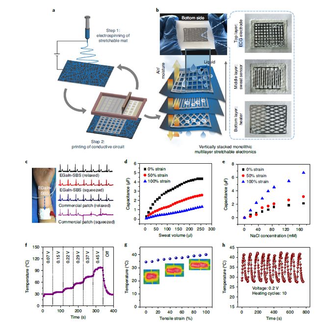 EGaIn-SBS的增材制造原理和自適應超彈性為通過印刷制造可拉伸電子產品提供了極好的平臺?;谠摴に嚨腖ED陣列能夠承受500%的應變和720°的扭曲,并能夠在水下工作。即使對其進行120分鐘的清洗,也不會影響LED陣列的性能。通過重復的靜電紡絲和印刷工藝,還可以制造垂直堆疊的多層電路,提供具有出色的佩戴舒適性和多功能性的新型的整體可拉伸電子產品。作者制備了三層印刷電路的可拉伸電子氈,分別用作生理信號傳感(頂層)、汗液傳感(中間層)和加熱(底層),實現了對人體生理狀態(tài)和電熱療法的多通道監(jiān)測。包括拉伸、壓縮狀態(tài)下對生理信號的監(jiān)測,汗液中溶質濃度的監(jiān)測以及表面溫度的調節(jié)等(30-90℃)。