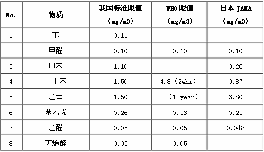 《指南》規(guī)定了車內(nèi)空氣中苯、甲苯、二甲苯、乙苯、苯乙烯、甲醛、乙醛、丙烯醛的濃度要求,與世界衛(wèi)生組織(WHO)及日本汽車工業(yè)協(xié)會(huì)(JAMA)限值的對(duì)比情況見表1所示。