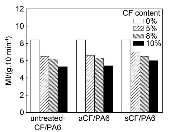 圖4為不同處理方法CF增強(qiáng)的復(fù)合材料的熔融指數(shù)對(duì)比圖。加入了CF的各組復(fù)合材料的熔融指數(shù)較純PA6均有下降。這表明CF的加入阻礙了PA6分子鏈流動(dòng),使得體系黏度增大,復(fù)合材料的流動(dòng)性降低。在進(jìn)行擠出加工時(shí),能使熔體在擠出后更易成型,從而改善復(fù)合材料的擠出加工性能。aCF/PA6復(fù)合材料組較未處理組熔融指數(shù)變化不明顯,sCF/PA6復(fù)合材料組的熔融指數(shù)則有小幅升高,推測(cè)是由于sCF表面的PA6薄膜覆蓋層降低了纖維與PA6基體的摩擦,在一定程度上反而增加了流動(dòng)性,使得熔融指數(shù)略有上升。