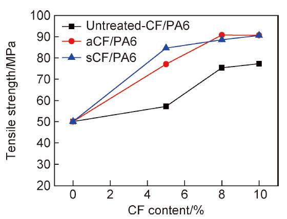 圖3是不同纖維含量的CF/PA6復(fù)合材料的拉伸強(qiáng)度曲線(xiàn)。改性處理后的aCF,sCF復(fù)合材料的拉伸強(qiáng)度均較原始CF有大幅提升;且隨著aCF,sCF添加比例的增加,復(fù)合材料的強(qiáng)度呈逐漸升高的趨勢(shì)。當(dāng)纖維添加比例為5%時(shí), sCF復(fù)合材料強(qiáng)度高于aCF;但當(dāng)纖維含量進(jìn)一步增加到8%時(shí),aCF的強(qiáng)度反而略高;當(dāng)含量達(dá)到10%時(shí),二者強(qiáng)度趨于一致。這是由于在纖維含量較低時(shí),纖維與基體的結(jié)合能力對(duì)復(fù)合材料強(qiáng)度的影響占主導(dǎo)地位,改性處理后的CF與PA6基體結(jié)合力更好,且sCF的結(jié)合力優(yōu)于aCF;隨著纖維含量的增加,CF對(duì)PA6的補(bǔ)強(qiáng)效果逐漸達(dá)到極限,因此,在纖維含量較高時(shí),不同的CF改性處理方法對(duì)復(fù)合材料的補(bǔ)強(qiáng)效果趨于一致。