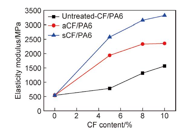 圖2 不同纖維含量的CF/PA6復(fù)合材料的彈性模量