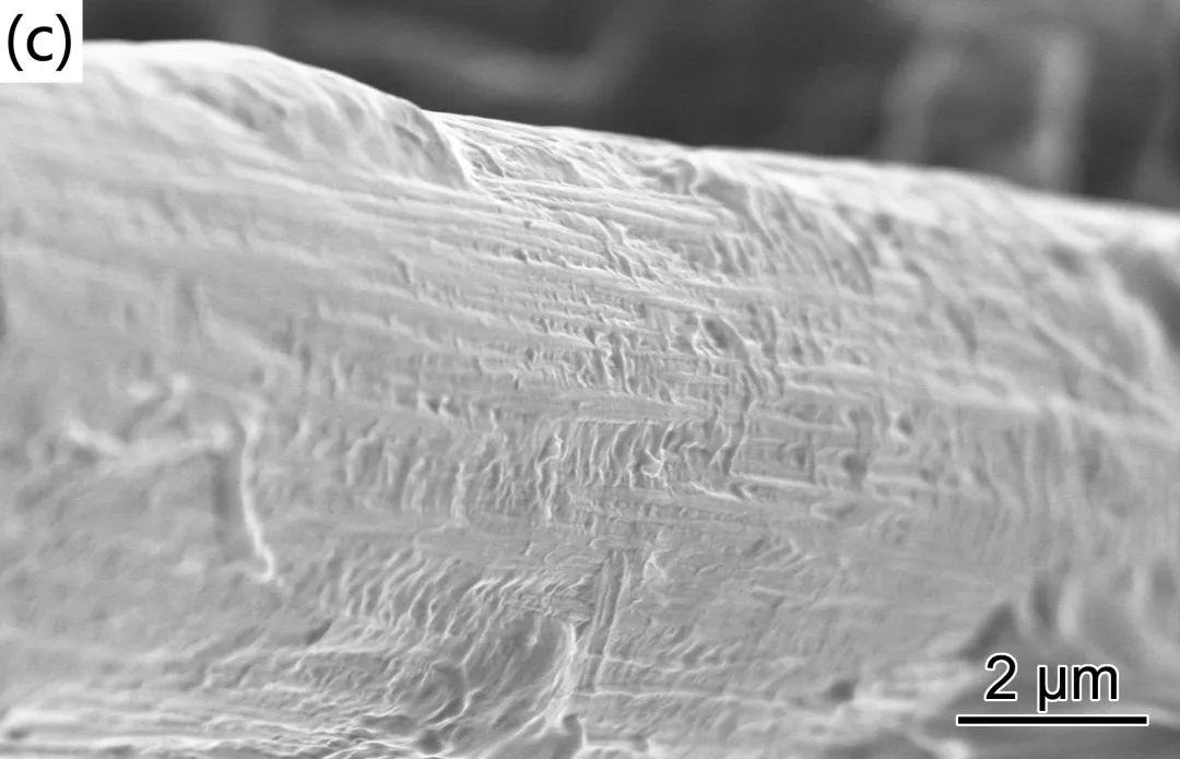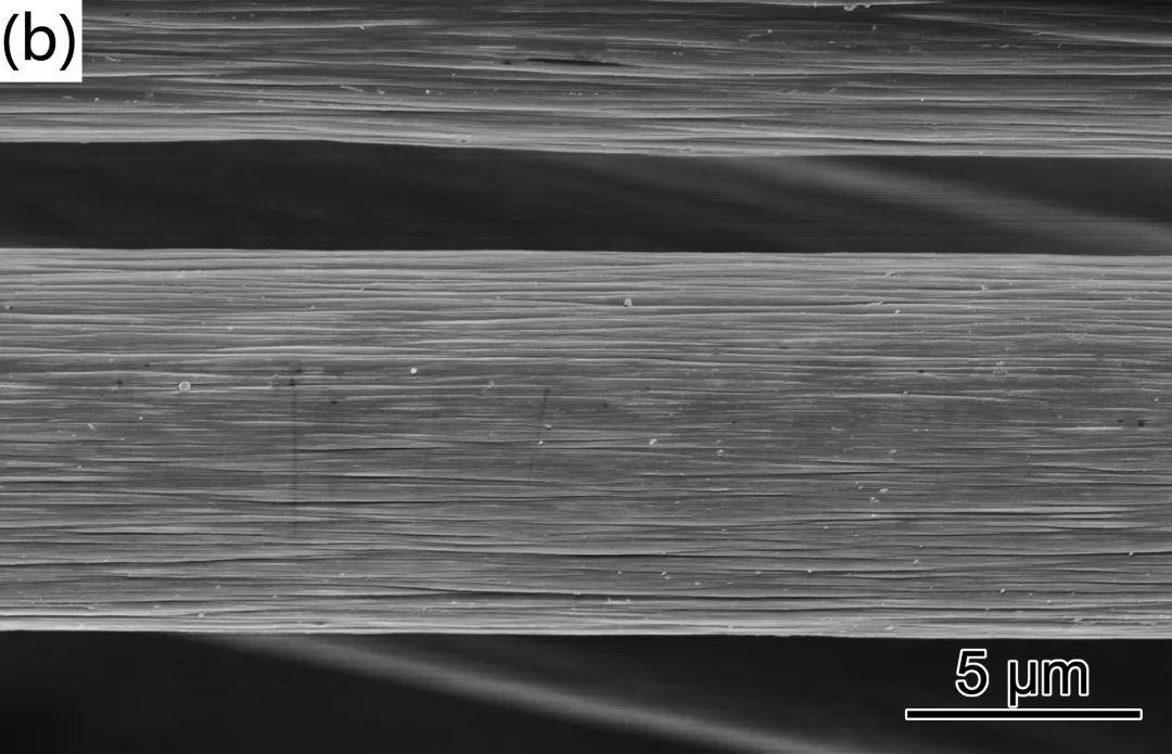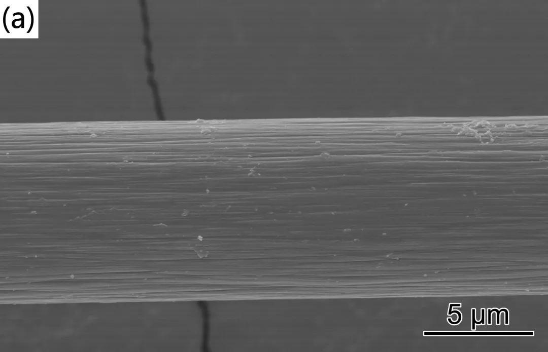 圖1是原始CF、酸化處理后的CF(aCF)、上漿處理后的CF(sCF)的SEM照片??梢钥闯?,原始CF(圖1(a))表面具有沿纖維軸向排列的溝槽。經(jīng)酸化處理后的aCF(圖1(b))表面粗糙度增加,縱向溝槽更加明顯。上漿處理后的sCF(圖1(c))除了沿纖維軸向的溝槽外,纖維表面還出現(xiàn)了大量褶皺,這表明經(jīng)上漿處理后,纖維表面包覆了一層連續(xù)的PA6薄膜覆蓋層。