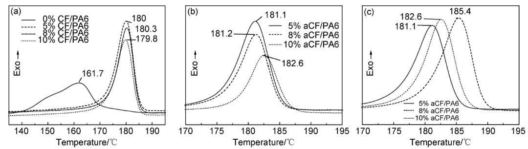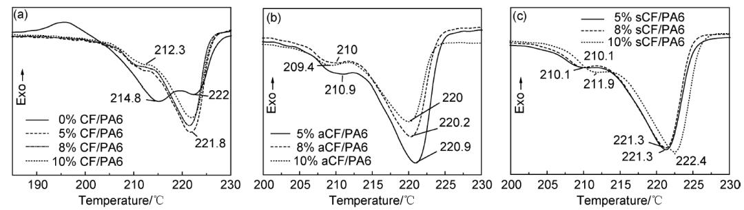 圖6是不同方法處理的CF/PA6復(fù)合材料的降溫結(jié)晶曲線(xiàn)。純PA6結(jié)晶峰溫度為161.7 ℃,加入不同比例CF后,其結(jié)晶峰向高溫方向移動(dòng),峰變窄,這表明復(fù)合材料內(nèi)部晶片變厚且均勻;結(jié)晶溫度區(qū)間大幅減小,說(shuō)明加入CF后,大大促進(jìn)了PA6的結(jié)晶速率,且使其結(jié)晶更加均勻、完善。經(jīng)過(guò)改性處理后的aCF,sCF復(fù)合材料(圖6(b),(c))則獲得更高的結(jié)晶溫度,未處理CF/PA6的結(jié)晶溫度約為180 ℃, aCF/PA6結(jié)晶溫度范圍在181~182 ℃,sCF/PA6的結(jié)晶溫度范圍達(dá)181~185 ℃。